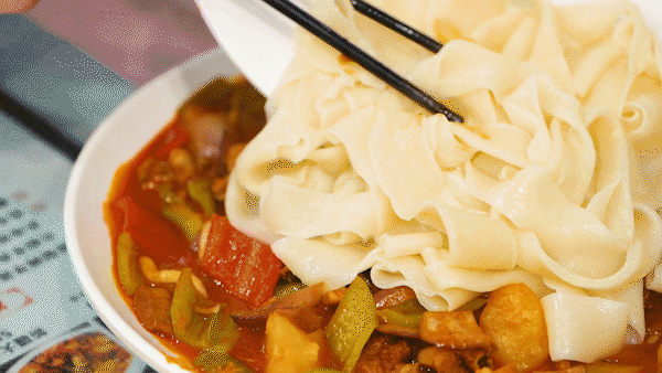 吃大盘鸡怎么能少了裤带面!两指宽的面直接倒进盘子里,轻轻滚一圈就裹满了汤汁,好吃程度可以和鸡肉媲美~(ps:只是有一点不懂,为什么大盘鸡里会有土豆粉?静待一个热心的宁夏宝子来解答一下...