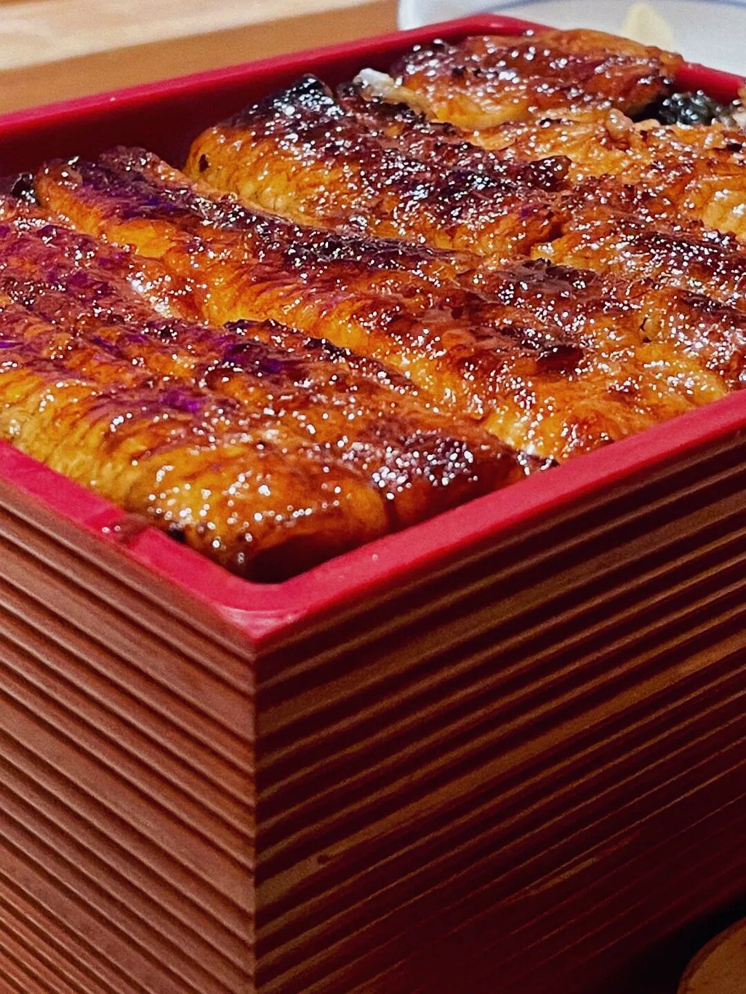 关东做法的烤鳗鱼需要先烤,再蒸,再复烤,复烤的时候刷上传统配方的酱汁。鳗鱼被烤得皮焦肉嫩,炭火香气十足。皮下脂肪都融进肉里,吃着细腻油润,毫无腥味。双层鳗鱼饭的配置也很良心,是一层鳗鱼一层饭,再一层鳗鱼一层饭的叠加~