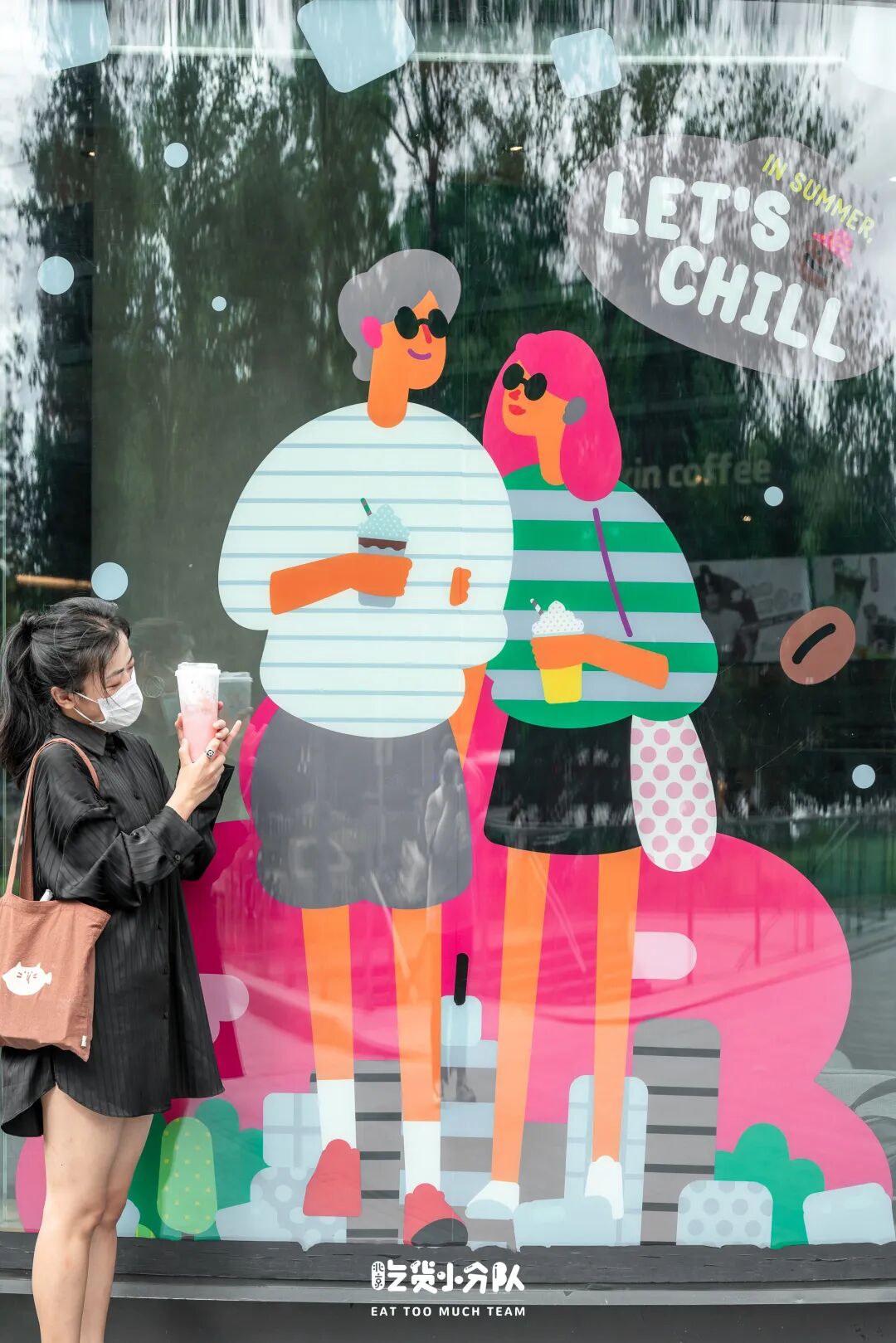 不只是杯套袋,整个主题店的装饰也有一种不一样的活泼感。夏日主题店相比其他门店多了一些手绘的大型贴纸,为等着吃冰的客人增添了一些夏日童趣氛围感。