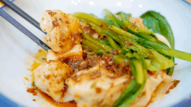 每份抄手里都会搭配油麦菜,红油口味里面的油麦菜是最入味的,直接吃竟然能吃出老式麻辣烫的感觉。