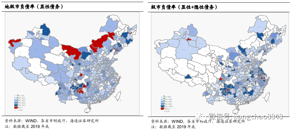 细化到各地级市债务情况,我们分别测算了2019年300+地级市显性负债率和包括隐性债务的总负债率,部分地区显性债务率超过50%,分布在内蒙古、贵州、东北三省的部分地区;总债务率超过60%的地区在贵州、江苏、湖南分布较多,其他省份也有零星分布,比如四川、安徽、浙江的多个地区也有分布。