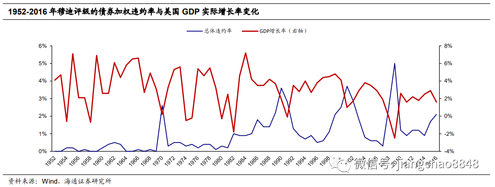 企业杠杆率对信用风险走向也有预测。从穆迪公司公布的数据来看,历史上债市违约风险的几次加剧均由经济过热后的急剧下跌引起。从经济过热的成因来看,市场主体的过度举债使短期投资规模迅速扩大,进而推动经济增长,最后表现为经济周期与债务周期的共振。从这一点来看,市场整体债务率走向具有提前预示市场违约风险的作用。1986年以来美国市场经历了三次债务周期,非金融企业杠杆率分别在1988年、2001年及2008年附近达到阶段性顶点,在此过程中债券违约率不断增长。随后泡沫破裂,去杠杆政策逐渐发挥效用,企业违约风险降低。整体来看企业债违约率的走向与杠杆率的变化存在1-2年的时滞,根据这一特性,可通过对企业杠杆率的表现预测未来企业债券违约风险的走向。