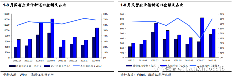民企借新还旧现象明显。从发债募集用途来看,1-8月借新还旧总金额达到4.97万亿元,占总发行金额的65.2%。进一步对企业性质进行分类,国有企业1-8月借新还旧4.68万亿元,占其总发行金额的65%;民营企业借新还旧2861亿元,占其总发行金额68%。相比国有企业,民营企业借新还旧现象更明显。