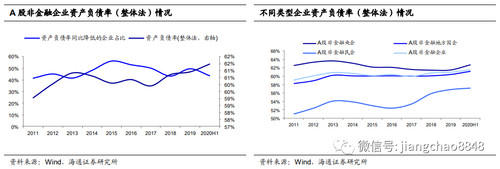 国企加杠杆较快,央企杠杆率较年初走高明显。截至20年6月末A股非金融央企的资产负债率(整体法)为62.68%,高出平均水平约1.2个百分点,地方国企平均为61.14%,而上市民营企业只有57.22%。从杠杆率变动情况看,20年6月末央企杠杆率较去年底上升约1.3个百分点,A股非金融地方国企及民企杠杆率较去年底分别上升0.7和0.3个百分点。