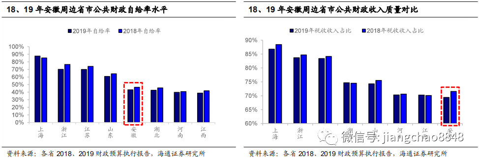 一般公共预算中,税收收入占比不高,且19年该比例发生下降。从地方公共财政收入结构来看,2019年安徽省地方一般公共预算收入为3182.54亿元,其中税收收入占69.43%,较上年下降2.11个百分比,在长三角及周边省市中排名最末;而2018年这一比例为71.54%,高于河南、江西两省,这主要是因为19年非税收入增长较多,而税收收入提高较少(从绝对数值来看两者分别增长12.15%、1.31%)。整体来看,安徽税收在地方公共财政收入中的比重不高,在70%左右,而其余三个长三角省市这一比例均在83%以上,尚有一定差距。