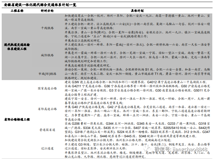 2018年11月在首届中国国际进口博览会开幕式上,习近平主席提出“支持长江三角洲区域一体化发展并上升为国家战略”,2019年12月1日,中共中央、国务院印发《长江三角洲区域一体化发展规划纲要》(下文简称为《规划纲要》),拉开长三角一体化建设发展的序幕。规划范围包括安徽全省16个市,其中,合肥、芜湖、马鞍山、铜陵、安庆、滁州、池州、宣城8个市为中心区。《规划纲要》提到,加强区域合作联动,要发挥上海龙头带动作用,提升上海服务功能,发挥苏浙皖比较优势,苏浙皖各扬所长。《安徽省实施长江三角洲区域一体化发展规划纲要行动计划》中提到,到2025年,安徽中心区人均GDP计划达到长三角平均水平的80%,全省人均GDP与长三角平均水平的差距持续缩小,中心区城乡居民收入差距控制在2.23:1以内,常住人口城镇化率达到62%。高质量建设合肥都市圈,成为支撑全省发展的核心增长极。2019年合肥市GDP超过9000亿元,达9409.4亿元,远超省内其他地级市;地方公共财政收入达到745.99亿元,是第二名芜湖(321.79亿元)的两倍多。2020年,合肥首次跻身15个“新一线城市”的榜单。安徽行动计划中提出,在长三角一体化过程中,要提升合肥省会城市能级,支撑全省发展的核心增长极。同时省内推进都市圈同城化步伐,建设合芜、合马、合铜、合滁、合桐发展带,后续芜湖、马鞍山、铜陵、滁州等合肥周边城市或持续受益。合肥都市圈深化与长三角都市圈协调联动。合肥都市圈重点加强与南京都市圈协同发展,加强与上海大都市圈对标对接,深化与杭州、宁波都市圈互动互补。处于合肥都市圈和南京都市圈之间的滁州、马鞍山等地区有望迎来新的发展机遇。提升互联互通水平,构建现代化基础设施网络。想要协同推进一体化进程,长三角区域互通互联是基础,基础设施建设是关键。一体化现代综合交通体系,包括铁路、公路、航空和海运(港口)系统,具体政策计划整理如下表。高铁线路规划对人口流动、产业发展有重要影响,重点关注轨道交通建设沿线辐射受益地区。