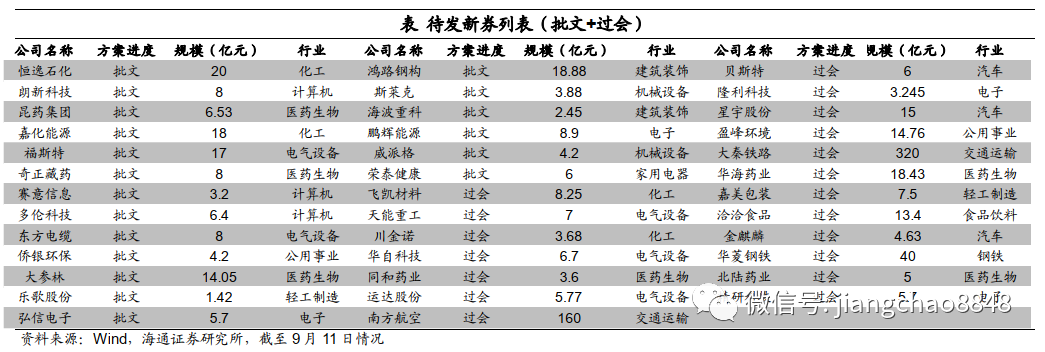 截至9月11日过会+批文转债共38只,规模813亿元,较去年同期(不考虑未发行的交通银行转债)规模相近,在近期较多核心标的赎回退出后新券供给也无需太担心。