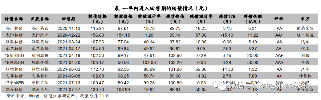 今年触发有条件回售的转债主要有辉丰转债、广汽转债和顺昌转债,公募EB主要有15国盛EB和16皖新EB。辉丰转债回售兑付,公募转债市场目前尚未出现违约的情况。未来一年内多只转债将进入回售期,部分转债有回售压力,可关注回售-下修博弈,但依然需要注意可能存在的信用风险。