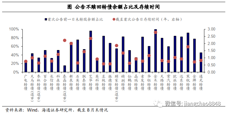 从历史上截至8月末公告不赎回转债的未转股余额和存续时间来看,超过半数存续时间在1年以内,未转股比例小于50%的有接近三分之一。但也有例如艾华转债和金禾转债,存续时间超过2年,欧派转债存续金额超过12个亿的情况。总体来看并没有一个很明确的规律。