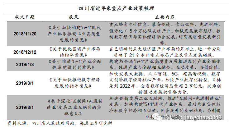 四川省近年来产业政策着重围绕构建“5+1”现代产业体系建设。2018年11月20日公布的《关于加快构建“5+1”现代产业体系推动工业高质量发展的意见》提出要重点培育电子信息、装备制造、食品饮料、先进材料、能源化工5个万亿级支柱产业,并积极发展数字经济,推动数字经济与实体经济融合发展。2018年12月12日公布的《关于优化区域产业布局的指导意见》则明确了21个市州具体的产业布局及重点发展领域。为了让金融更好的服务实体经济,2019年1月3日公布的《关于推进“5+1”产业金融体系建设的的意见》提出要构建与全省“5+1”产业高质量发展相适应的产业金融体系。