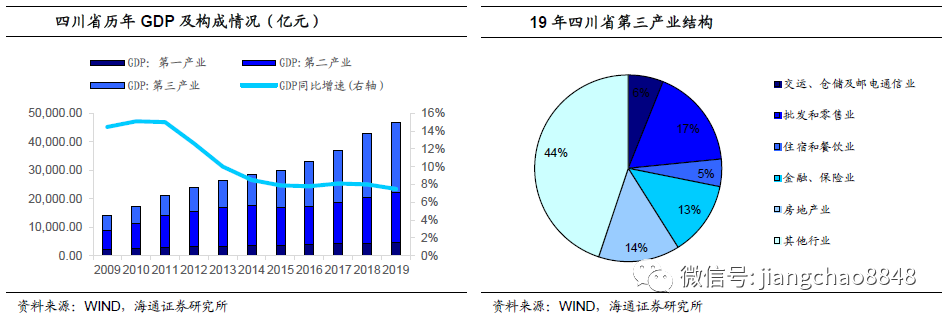 四川省近年来经济一直保持较快发展,近五年的加权GDP年增长率为7.86%。从产业构成上看,第三产业占比最大,且近年来占比增长较快,于2016年以47.23%的占比成为三产中占比最高的产业。从过去十年三产的发展趋势上看,第二产业稳步发展,第三产业快速崛起,产业结构逐渐优化。第三产业结构方面,2019年数据显示,除去其他行业,批发和零售业占比最大(约17%),房地产业次之(约14%),住宿和餐饮业占比最小(约5%)。