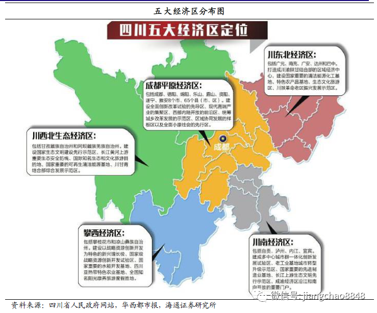 成都经济一枝独秀,地形特征叠加资源禀赋影响各地区产业选择与发展。1)四川下辖21个地级市分为成都平原经济区(成都、德阳、绵阳、乐山、眉山、资阳、遂宁、雅安)、川南经济区(自贡、泸州、内江、宜宾)、川东北经济区(广元、南充、广安、达州、巴中)、攀西经济区(攀枝花市、凉山州)和川西北经济区(甘孜州、阿坝州),地形起伏度与人口经济呈现空间负相关。2)成都经济贡献一骑绝尘,成都平原经济区承担四川省重点产业发展。2019年成都GDP占全省总量36.5%,约1.70万亿元,除成都外7个成都平原经济区城市组成环成都经济圈,平均GDP达1611.85亿元,增速均在7%以上,绵阳德阳GDP均超2000亿元。3)川南经济区可称全省第二经济增长极,宜宾泸州GDP过2000亿元,着重打造世界级白酒产业集群,发展临港经济和通道经济;川东北经济区作为出川综合交通枢纽中心,发展川渝陕甘结合部区域经济,承接中部产业转移,南充达州发展较好;攀西和川西北经济区依托地形和矿产、水能和光热资源优势,重点发展特色农牧业与能源化工产业,创建生态建设示范区。