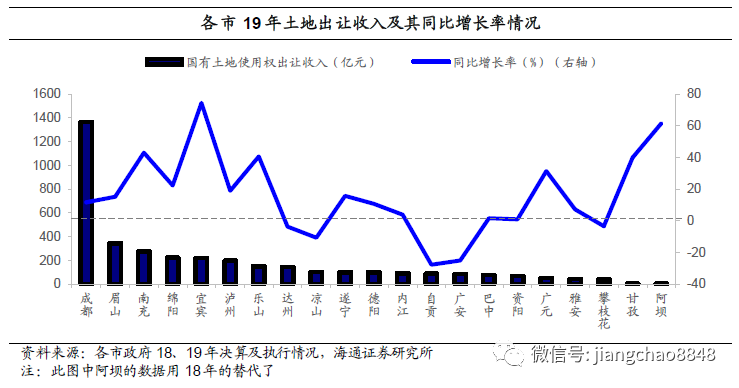 同比增长率方面,2019年宜宾土地出让收入同比增速排名第一,仅5市呈负增长。2019年宜宾土地出让收入同比增速为74.4%,较排名第二的南充(43%)高约30%。成都同比增速为11.7%,位列除阿坝外20个市的第10名。攀枝花、达州、凉山、广安、自贡五市增长率为负,分别约-3.4 %、-3.7 %、-10.7 %、-25.0 %、-27.8%。值得一提的是,阿坝2018年土地收入同比增长率很高,约61.5%。五大功能区中,19年川南、成都平原平均增长率超10%,分别约17.3%、15.5%。攀西平均增速为负,约-7.1%。