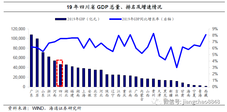 GDP总量居全国上游。2019年四川省GDP总量位列全国31个省级行政区中第6名,约为4.66万亿元,在西南地区排名第一。四川经济总量较18年增长约7.5%,经济增速较快。但从人均水平看,四川省2019年人均GDP为5.58万元,处于中下游水平,较全国平均水平的7.09万元尚有一段距离。
