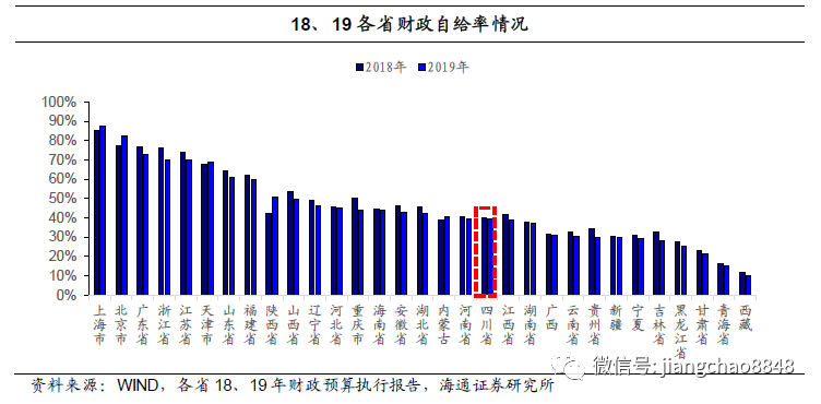 财政自给率居全国中下游水平,且19年略有下降。2019年四川省财政自给率(一般公共预算收入/一般公共预算支出)约为39.34%,比2018年四川省40.24%的财政自给率降低了0.9个百分点。2018年及2019年四川省的财政自给率均在全国31个省、市及自治区中的19名,居全国中下游水平。