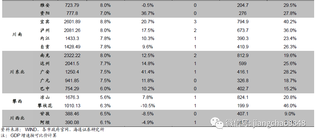 根据上述经济财政各项指标总体来看,各地级市中,成都、绵阳、宜宾、泸州、南充资质相对较好。