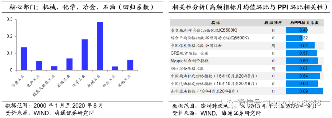 按工业部门细分,可将PPI可分解为15个工业部门,用这些工业部门分项同比数据对PPI同比进行回归分析,回归系数显示影响PPI走势的核心变量主要是机械、化学、冶金、石油等工业部门。这四个核心分部门相关高频指标,与PPI环比相关性较高的有钢材综合价格指数、Myspic综合钢价指数、中国柴油批发价格指数、南华原油指数、中国煤炭价格指数(全国综合),与PPI环比的相关性均在0.5以上。![]()