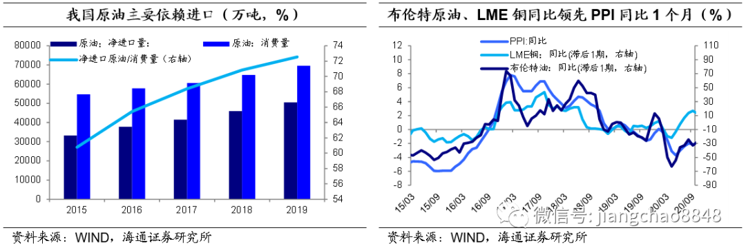 布伦特原油、LME铜同比变化领先PPI同比1个月左右。我国原油消费主要依赖进口,2015年以来,原油净进口量占国内原油消费量的占比逐年稳步提升,截至2019年末,原油净进口量占比高达73%左右,近年来国际油价对国内油价的影响相对较大。由于国际油价传导至国内市场需要一定时间,因此国际油价对我国PPI变动具有1个月左右的领先期,此外,LME铜也领先国内PPI一个月左右。![]()