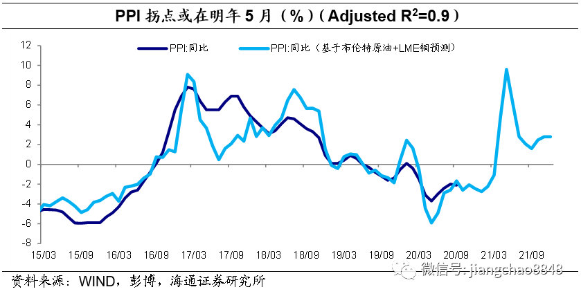 相比于LME铜,国内市场螺纹钢价格的变动对PPI的影响更为显著和直接,螺纹钢价格同比增速领先PPI同比增速1个月左右。国际油价和国内螺纹钢价格的变动解释了我国PPI同比增速的94%左右,且对PPI拐点的预测效果相对较好,预测结果表明PPI拐点大概率在明年5月份,拐点值或在5%左右。![]()