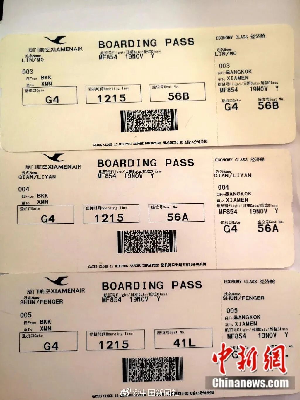 妈祖(原名林默)、千里眼和顺风耳从曼谷返回厦门的登机牌 图片来源:中新网