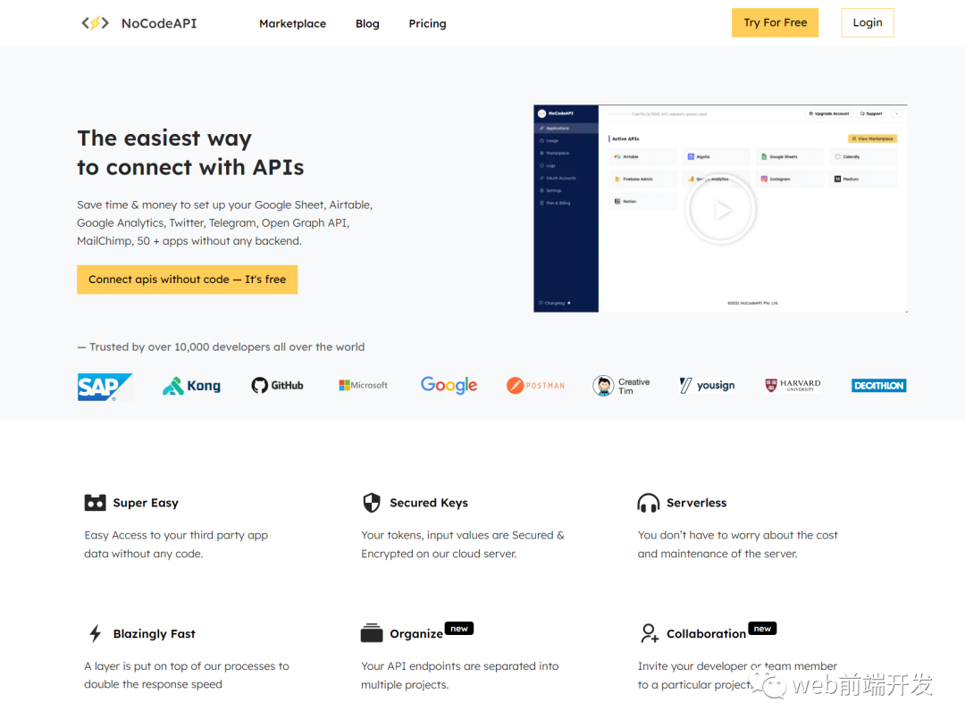 NoCodeAPI 让你无需后端即可设置 50 多个应用程序,包括 Google Sheets、Airtable、Google Analytics、Twitter、Telegram、Open Graph API、MailChimp 等,从而节省你的时间和金钱。