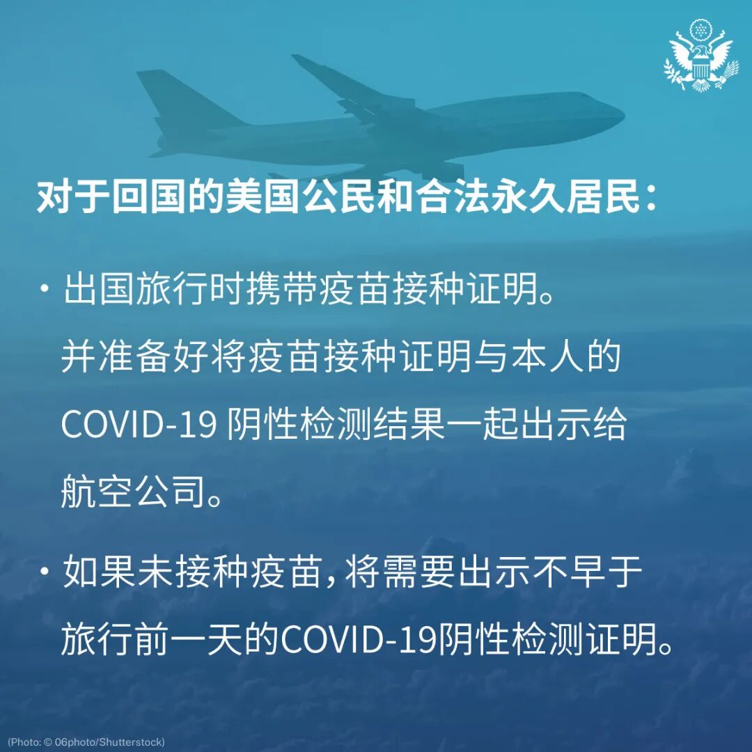 那些已接种疫苗的人仍需要提供在其航班起飞前三日内的检测结果。请查看COVID-19旅行者信息(state.gov) 和cdc.gov 上的信息,确保为国际旅行和返回做好准备。