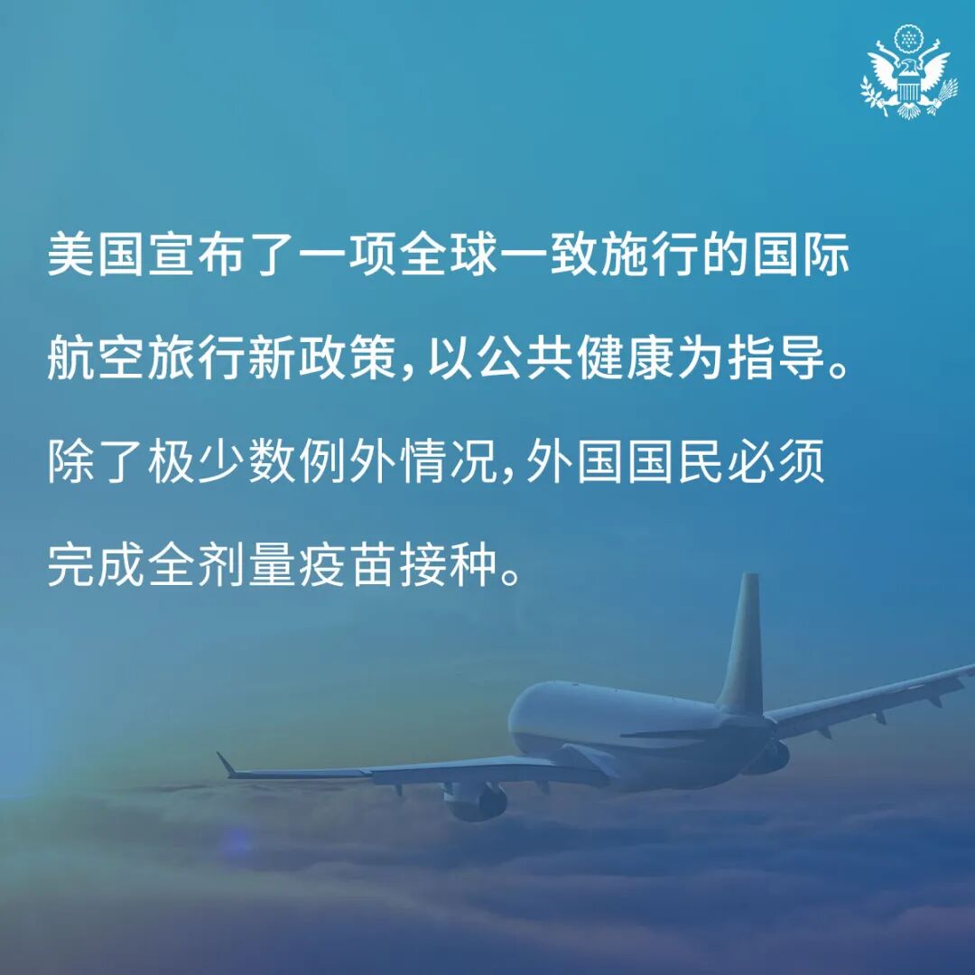 从11月8日起,前往美国的外国国民航空旅行者将被要求完成全剂量疫苗接种,并在登上前往美国的飞机前提供疫苗接种状况证明。这项政策将公众健康放在首位。它是一致和严格的,保护美国公民和居民以及那些来访者。