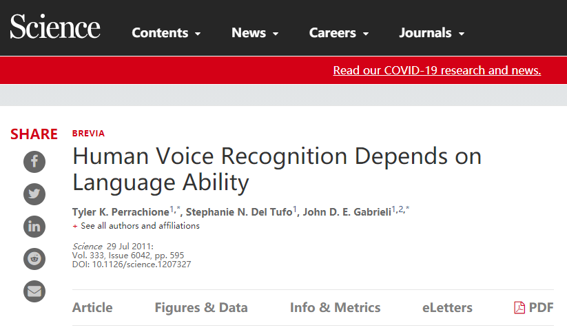 刊登在 Science 上的这篇文章,题目为:Human Voice Recognition Depends on Language Ability (2011年7月29日),作者是美国麻省理工学院(MIT)的三位研究人员。