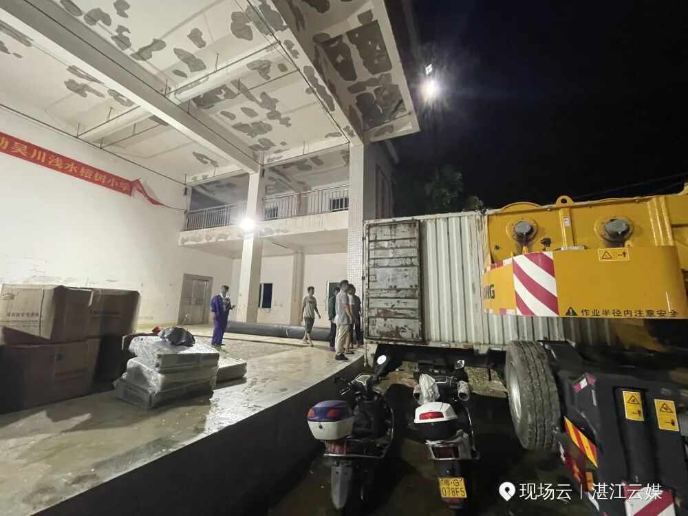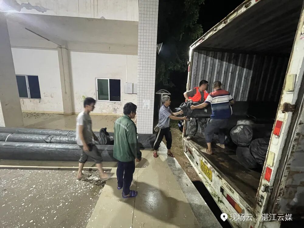 吴川市浅水镇石碧村委会榕树村干群正在村文化楼搬运油布等防汛物资。