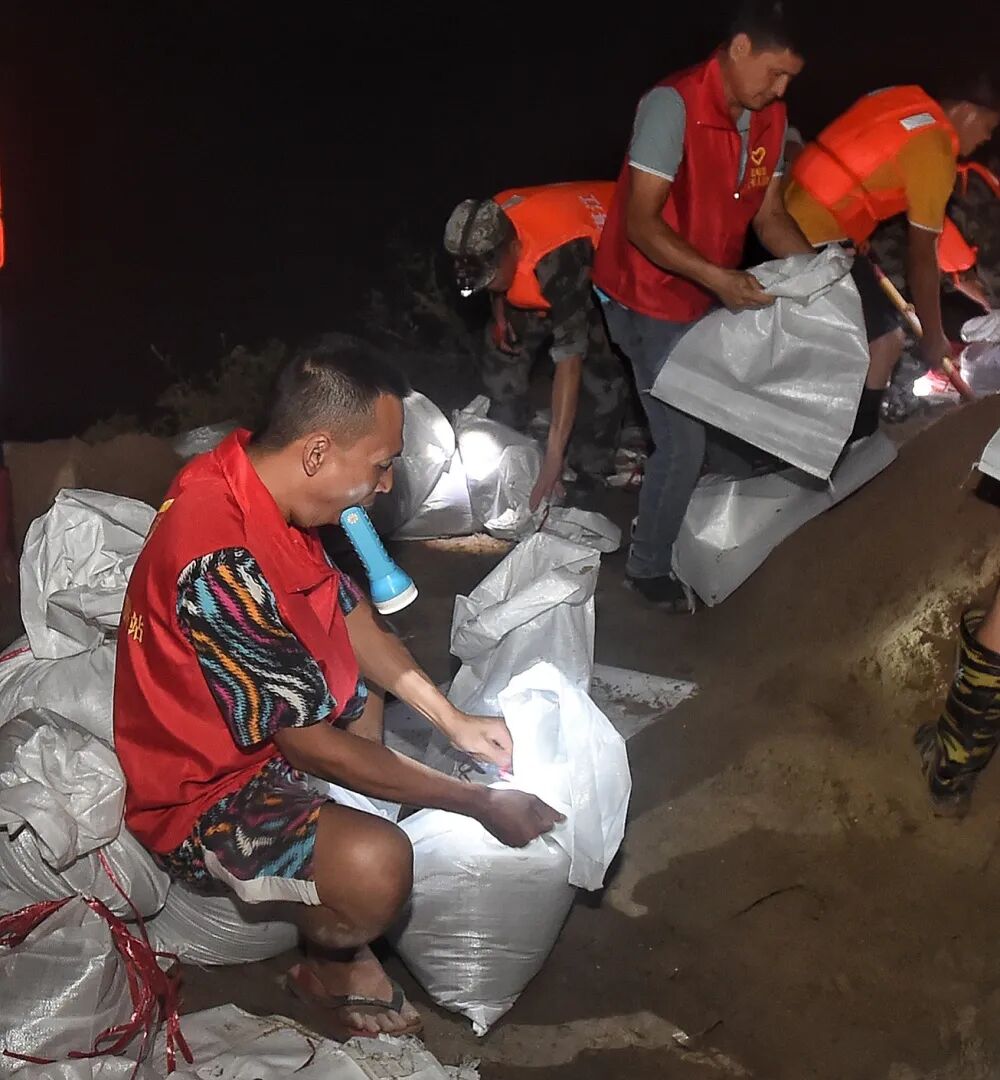 袂花江水利所和兰石镇相关负责人巡河时发现,袂花江塘口段出现管涌。经研判,需要建设一个反滤体。8日凌晨1时,接到指令的34名民兵应急排迅速赶到现场,与水利部门联手投入战斗。他们分工合作,有的装沙包,有的扛沙包,手递手,心连心,一包一袋堆垒起一个坚固的反滤体。