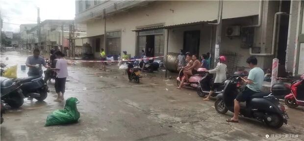 内涝严重的梅菉街道瓦窑村,积水在减退,现在还没复电。在博铺街道新东路鞋业街,积水退去留下水痕,早上开始已减退了约0.5米。积水路段还拉着警戒线,群众纷纷绕路。记者看到,由于积水不深,有群众出来接收从外面送来的早餐及肉菜。