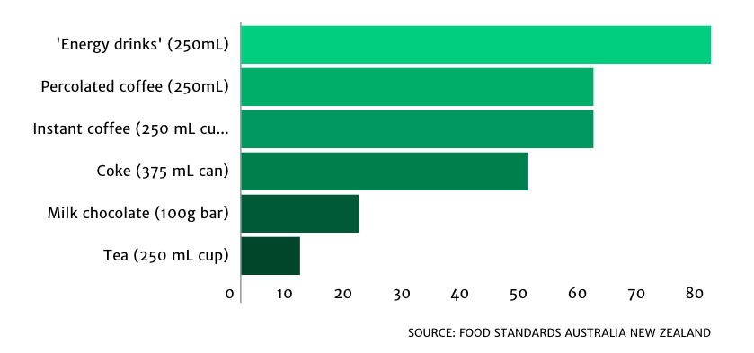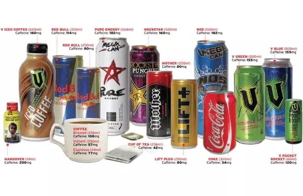 此外,市面上销售的许多能量饮料的咖啡因含量都超过了人体的安全极限,部分新型能量饮料的咖啡因含量甚至达到500毫克,等同于5杯高浓度咖啡!