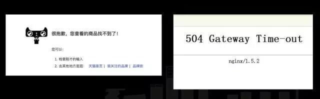 详情还是那个详情,只不过是商品详情变成了错误详情。第一张页面:很抱歉,你查看的商品找不到了。有可能是你访问的方式不对,比如 URL 上面少了一些参数,也可能是后台真的出问题,对于用户还算是比较温柔的一种方式。第二张页面:很可能就是网站真的出问题了。比较可能的原因是后台没有合理的处理超时导致前端异常。不过说实话,这个页面我也非常少的见到。如果真的出现了,那基本就是一次非常严重的事故。