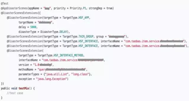 理论上通过上述的方案,在业务流量输入方面,我们没有任何要求。无论是人的自发测试行为,还是机器的测试行为,都没有任何限制。只不过为最大限度复用已有的测试用例积累,提高自动化程度,我们设计了一套用例注解,封装了和强弱依赖服务端的通信。利用 Junit 生命周期的特点,完成故障规则的下发和清除。