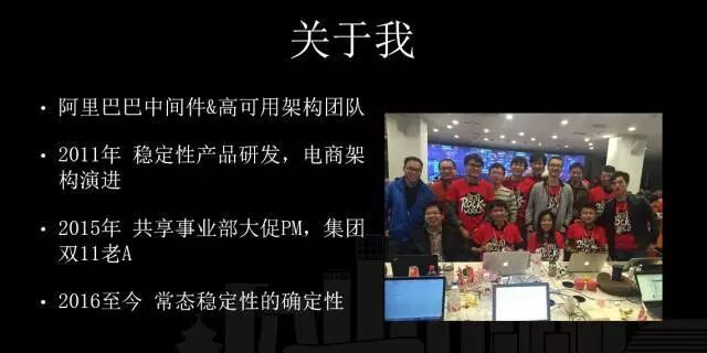 共享事业部对于在座各位可能比较陌生。如果我换一个说法,商品、交易、会员、优惠、评价、中间件,大家应该就都知道了,这是双 11 当天最具挑战的链条之一。右边是中间件核心作战室成员,在过了双 11 业务高峰后的一张合影。2016 年至今,工作的重点在常态稳定性的确定性方面,今天的分享也是主要围绕这部分内容。