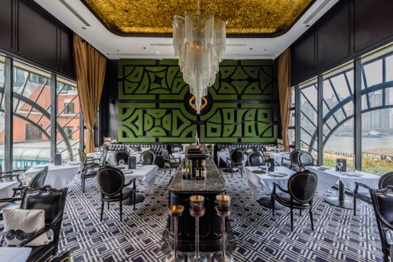 餐厅虽是以黑白为主色调,但是无论大厅还是二楼,两侧均是整面的落地玻璃窗,视野开阔。窗外,一边是波澜壮阔的黄浦江,一边是艺术气质浓郁的老码头,两处风景全然不同,是天然的流动画卷。