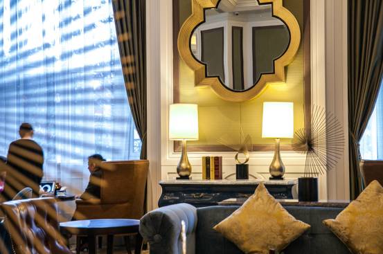 慵懒曼妙的午后时光,最适合去乐吧大堂酒廊享用一顿经典法式下午茶。出自HBA之手的暖色系装饰风格,宝蓝色的布艺沙发、墙上悬挂的金色镜面,整体呈现出奢华却不繁杂的美感,名媛绅士们在这里聊天、喝茶、谈生意,沙龙文化氛围十足。