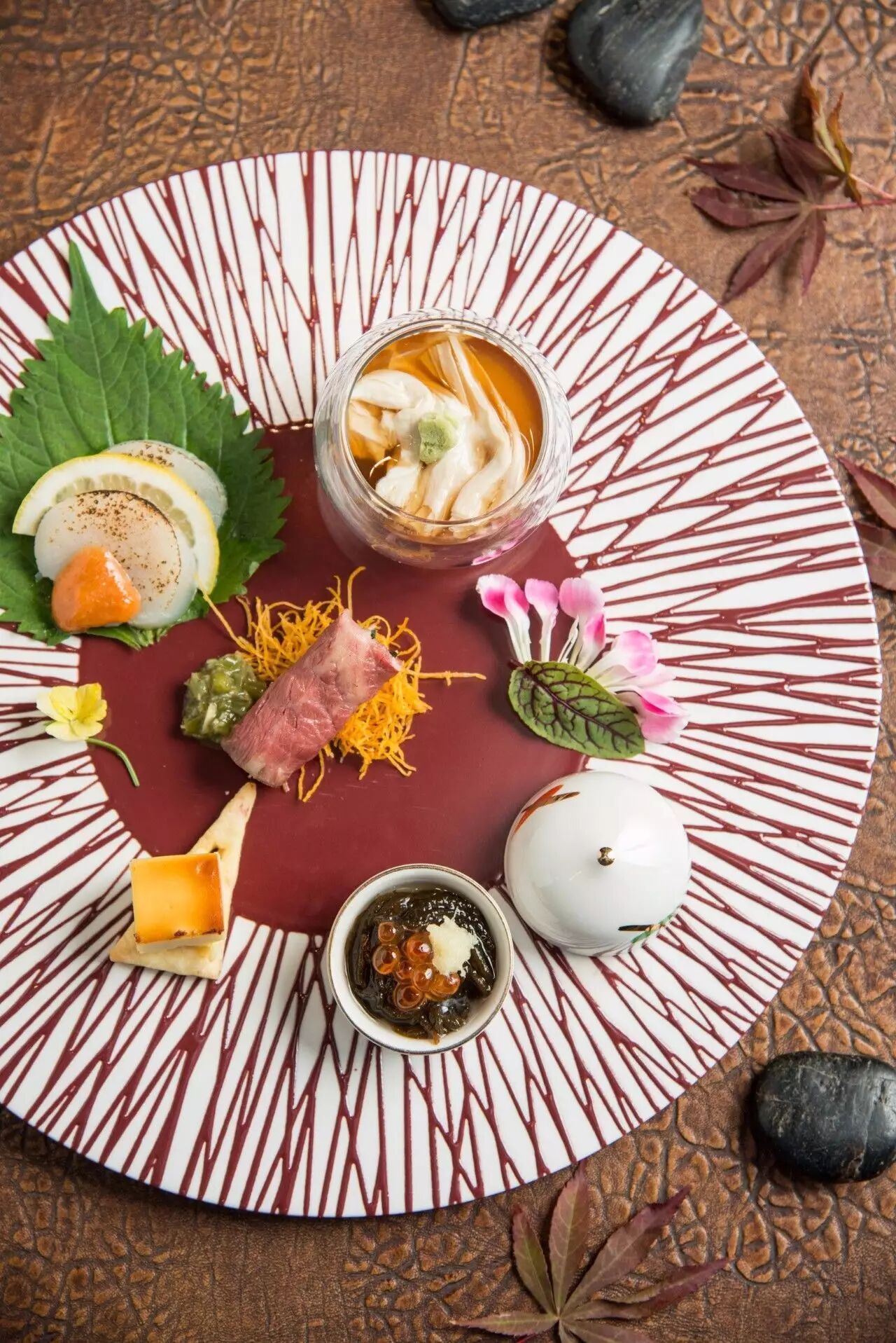 前菜由5种小菜组成:半烤牛肉、芝士豆腐、酸味发菜、烤带子和腐竹,五种小菜分别代表了五种味道。最中间的是半烤牛肉,鲜嫩多汁,外围绿叶上的是带子,加上味增酸甜可口;玻璃碗里装的是腐竹,用柴鱼高汤煮过非常鲜;白瓷碗里装的是酸味发菜,味道清新;芝士表面则是涂上酱油,再用喷枪烤,入口浓郁软滑。