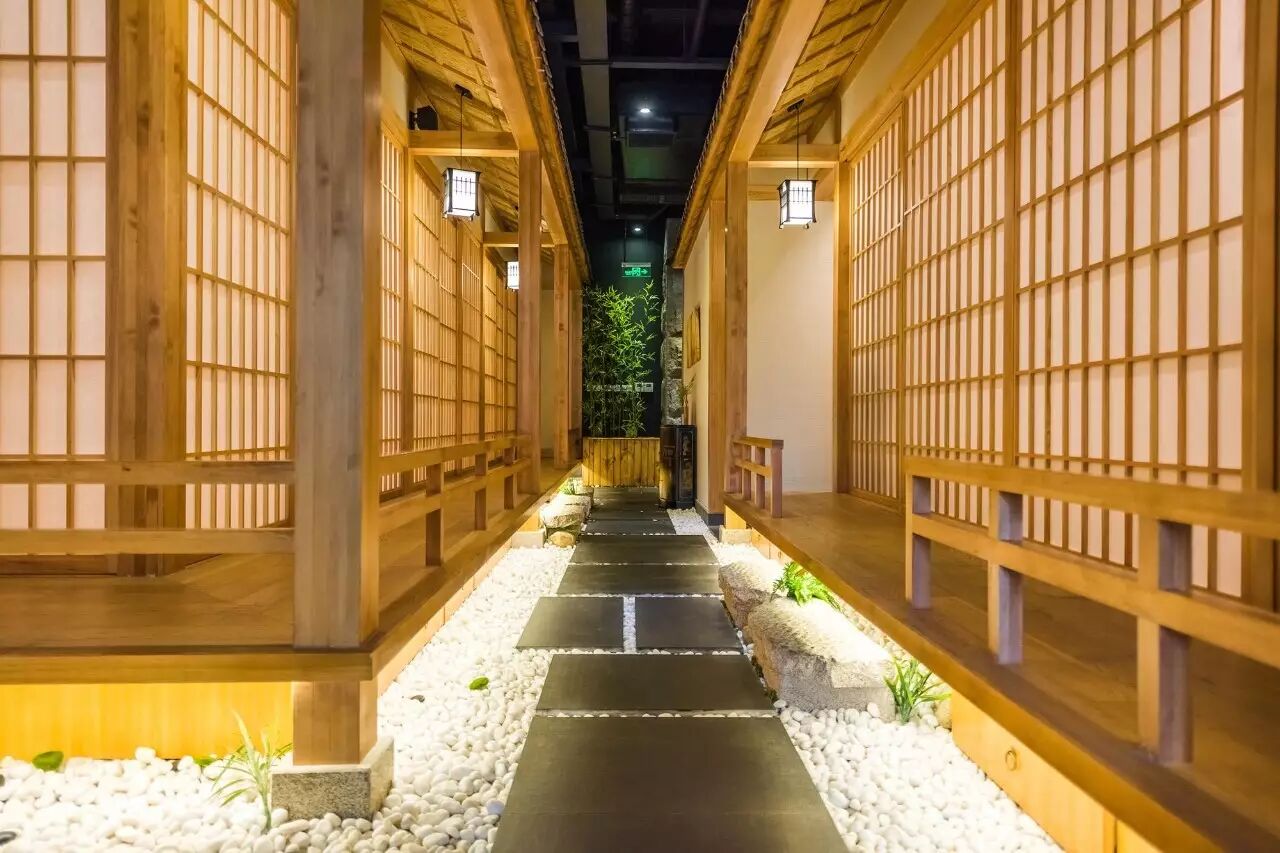 轻嗅空气中的原木香气,聆听传至耳畔的日本歌谣,看着眼前的灯影石景,就如在半梦半醒间穿梭到了日本的私家庭院。