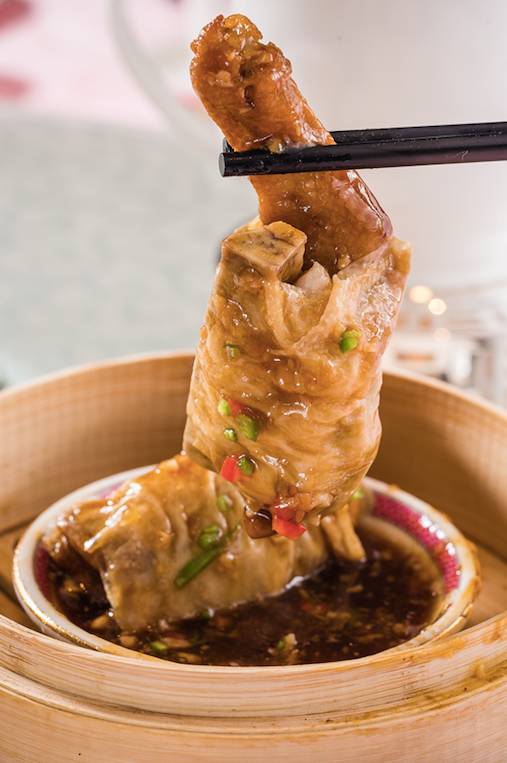 鸭掌放入秘制的白卤水炖煮入味,和着炸过的芋头条、调制好的烧卖肉馅,经过豆腐皮的层层包裹,淋上鲍鱼汁,老抽上色,蒸煮10分钟左右即可。入口后,口感丰富,软韧均有,香气四溢的鸭脚扎,越嚼越香,馅料也互不串味,一定要趁热吃哦。