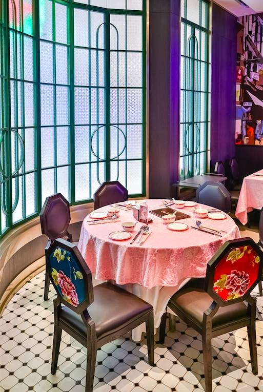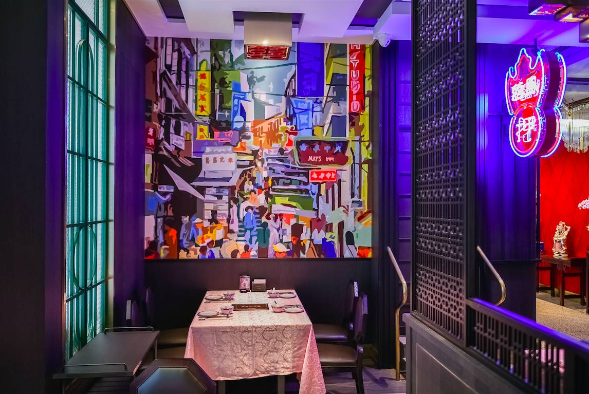 整个餐厅的装饰充斥着跳月的颜色,木制屏风、粉色桌布、苏绣布艺、霓虹灯招牌、香港市井壁画,无论你生于什么年代,都能在这里找到一份香港记忆。