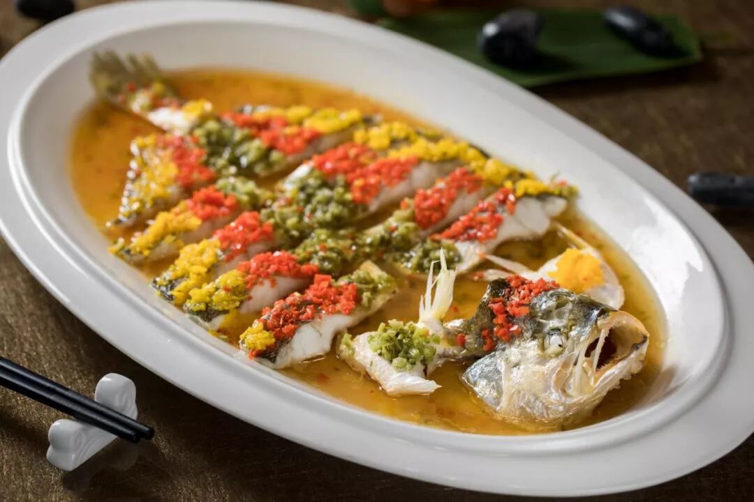 来到上海,福禄居的传统粤菜也有添加了不少本帮淮扬的元素,更符合上海人口味。这一道五味酒香大黄鱼,选用1斤6两左右的野生大黄鱼,整只剔骨铺陈,洒上灯笼椒、榨菜、雪菜、虾籽等食材,再与猪肉、老鸡、火腿熬制的上汤一起蒸制,兼顾颜值与口味。