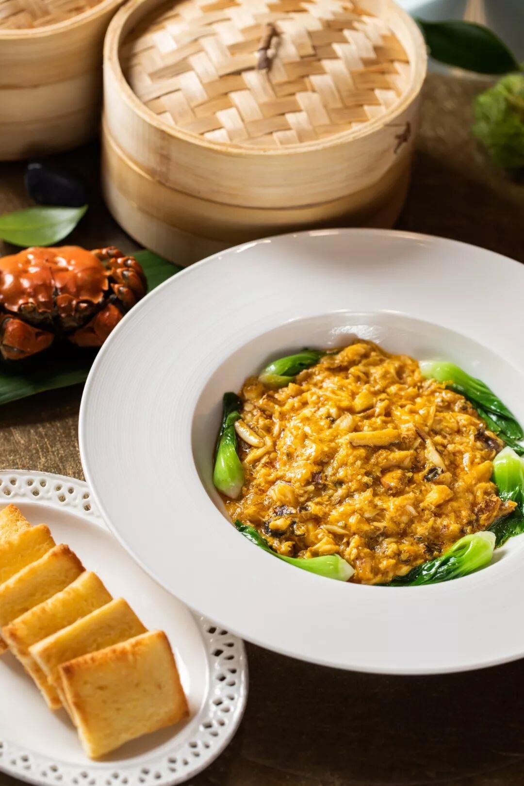 除了前面的港风蟹菜,这次的秋宴也有不少本帮蟹菜的踪影。家常的蟹粉嫩豆腐,看似简单,却也是俘获味蕾的存在!洁白如玉的嫩豆腐切小块与炒过的蟹粉一同烹制,金灿灿的蟹粉泛着油润的光泽,浓郁的蟹香气直窜鼻腔。