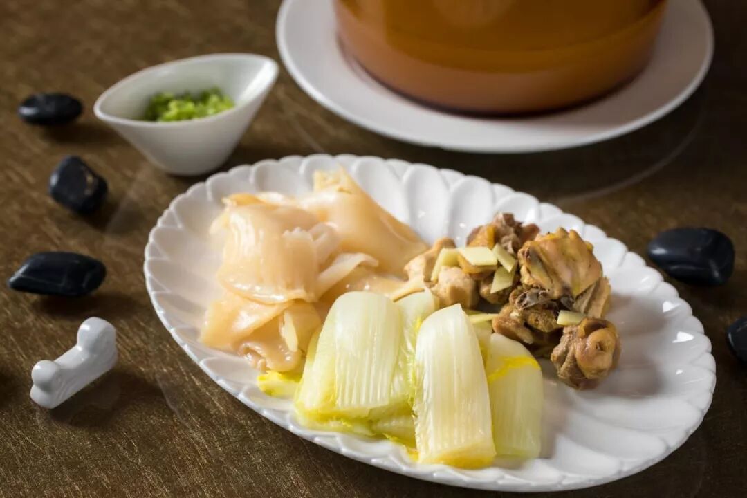 呈上桌后,服务生会依次将高山娃娃菜、鸡肉、花胶落入汤中,很有仪式感!花胶选用的是3至4头大的,一个个都弹滑饱满。所有食材在锅中慢慢炖煮几分钟即可食用,雾气混着鸡汤的香气飘散开来,闻着就让人感觉很治愈。