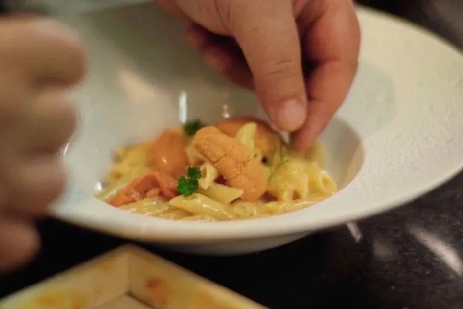 餐前,主厨特制的开胃餐点及面包一下子就俘获了味蕾。水煮白芦笋配5J火腿,火腿饱满的油脂渗入白芦笋,碰撞出别样的鲜美。意式手工卷面配海胆,更是富有层次,叫人回味无穷。