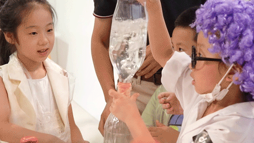 为了让小朋友更直观地感受到“水龙卷”中的气流,工程师们接着让小朋友在瓶中加入彩色颜料和彩色珠片以及清洁剂等道具。