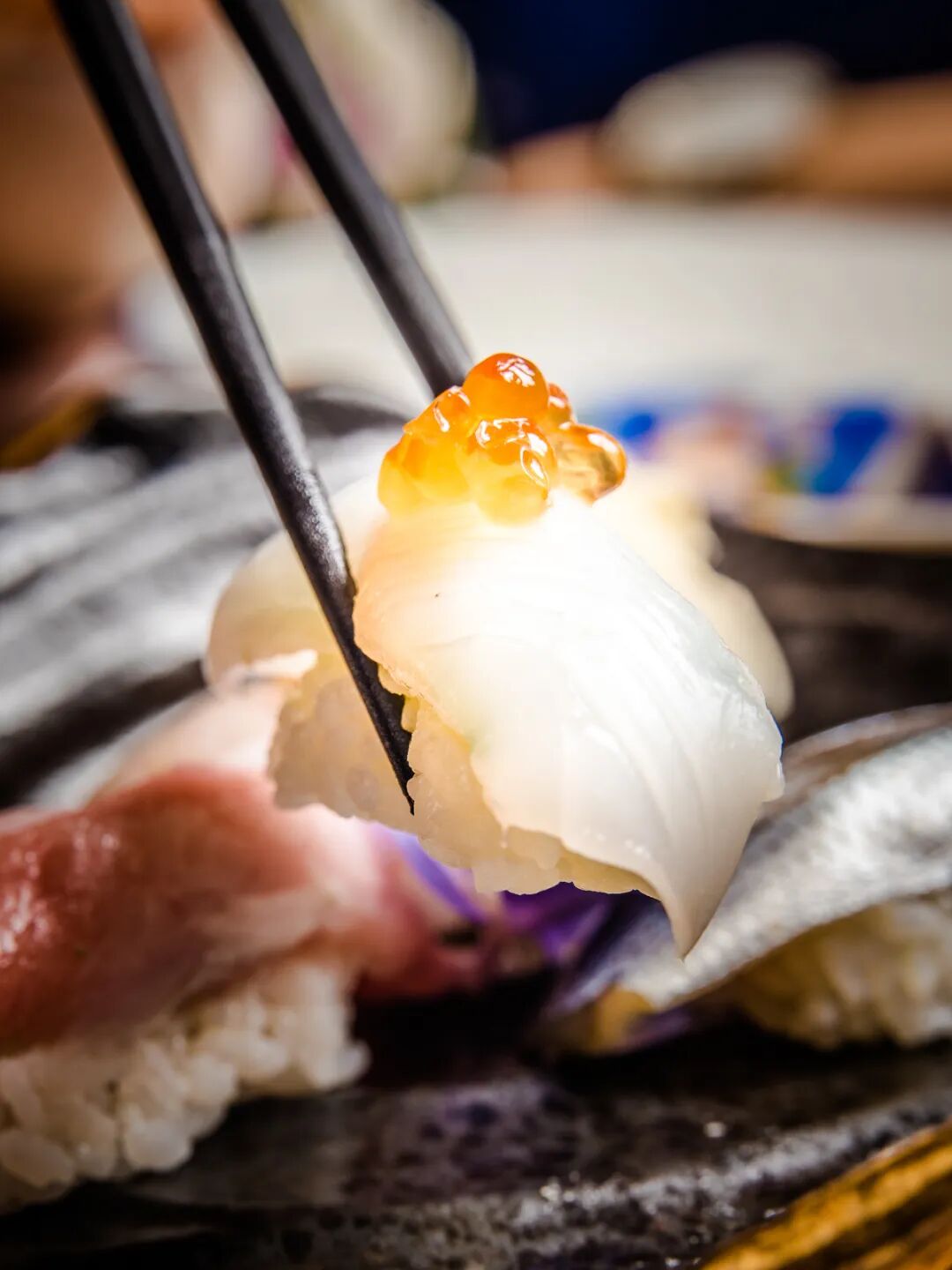 这贯油墨鱼寿司,晶莹剔透的油墨鱼上顶着几颗鲑鱼子,入口随即迸发鲜味,鱼肉软糯微弹,回味一股沁人的甜润。