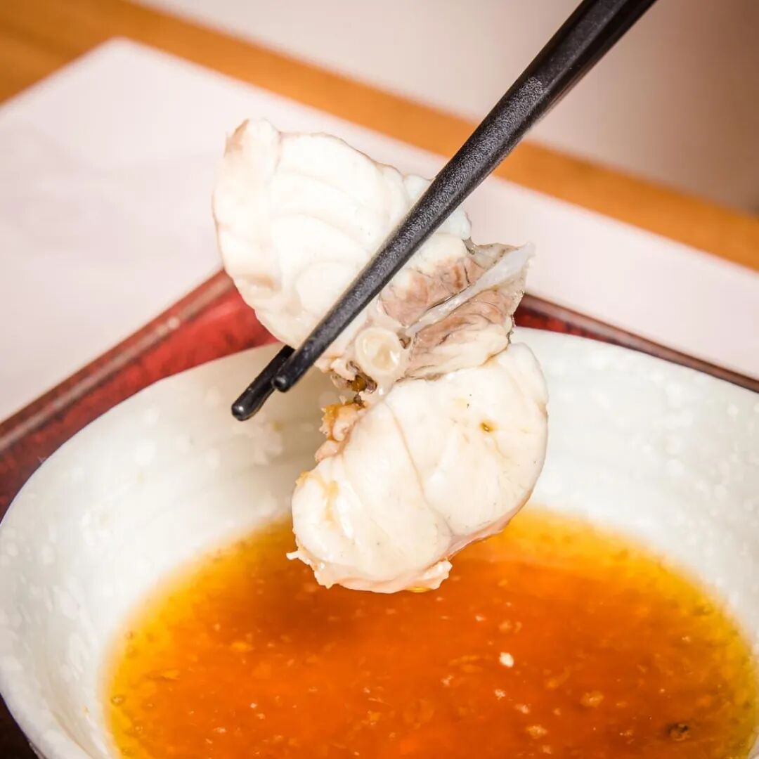 首先登场的河豚鱼刺身薄如蝉翼,透明鱼肉上布有好看的纹路,漾着诱人光泽,无味之味堪称极高境界。一起上桌的还有河豚鱼皮丝,拌上柠檬醋,又脆又滑又酸爽,像一道开胃小零食,好吃到根本停不下来。