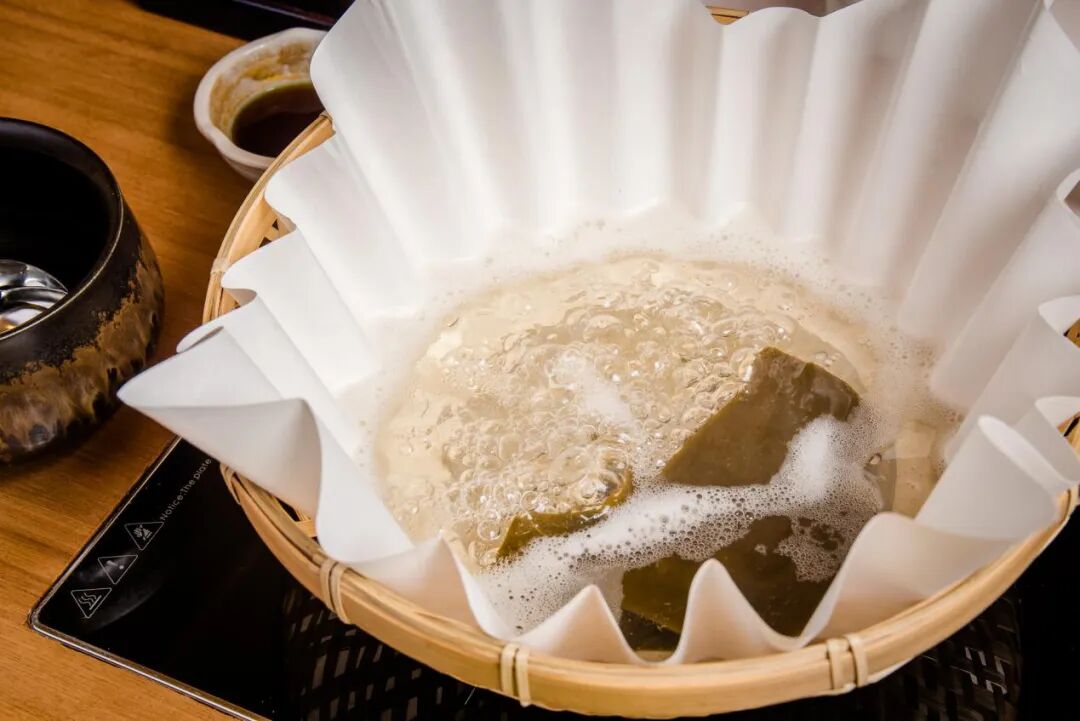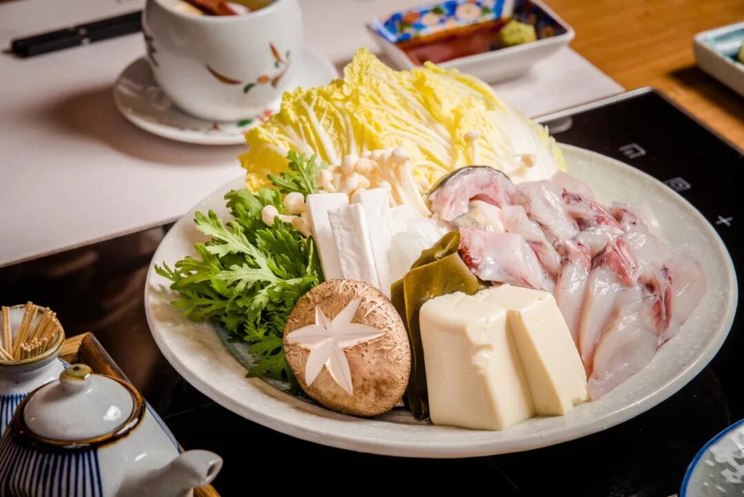 饶有仪式感的河豚火锅,纸锅里盛着昆布清汤,淡雅清甜,不抢主角风头。
