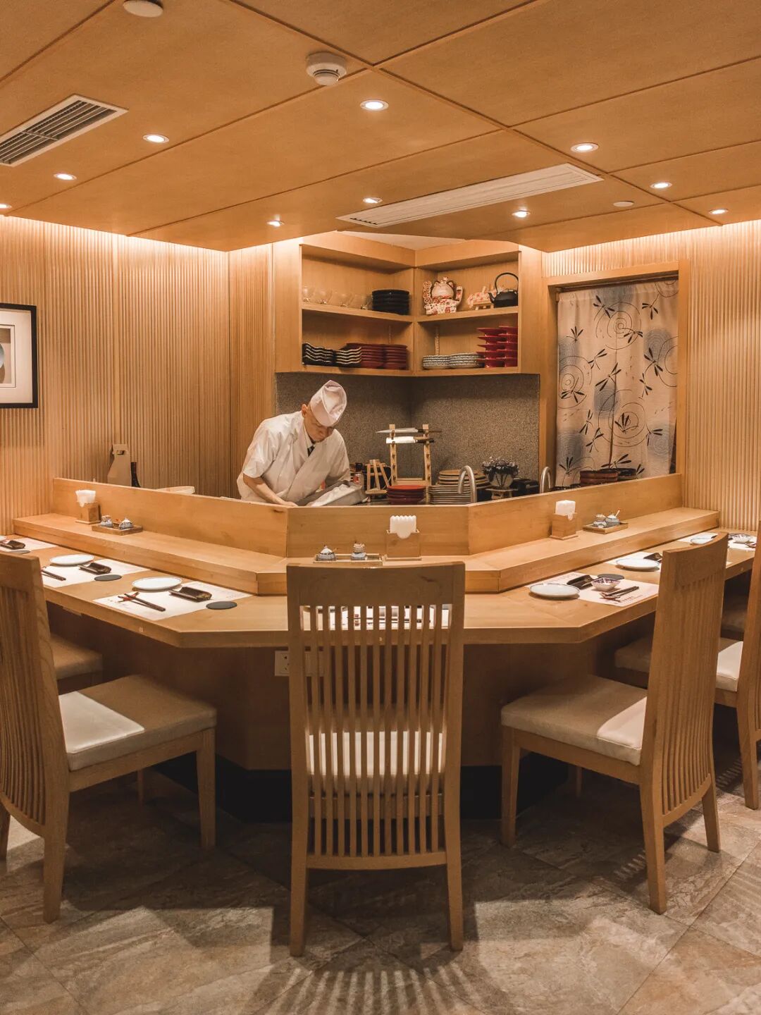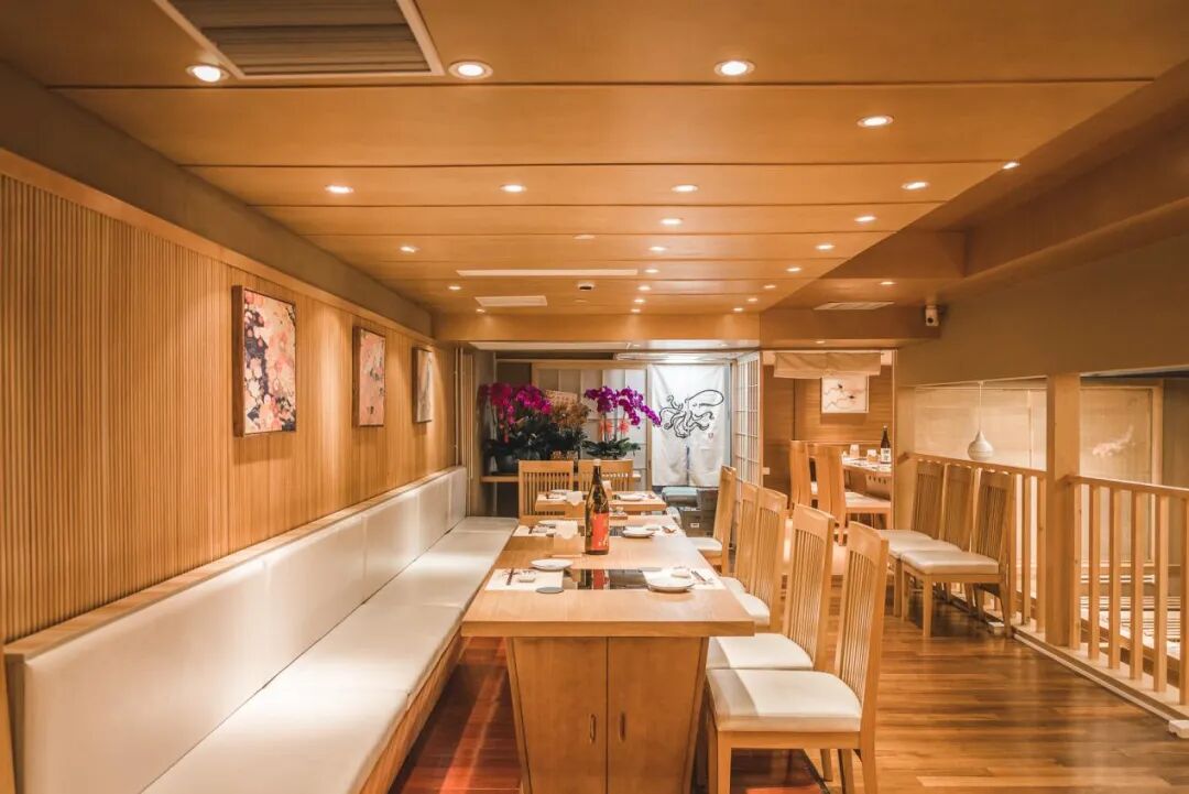 店里的C位绝对是一楼的寿司台区域,板前仅设7席座位,全木制装修,简单整洁,配合柔软的暖光,温馨又不失庄严的仪式感。